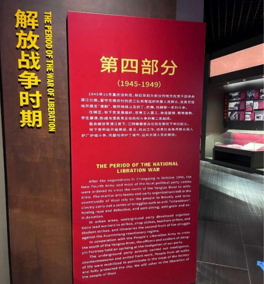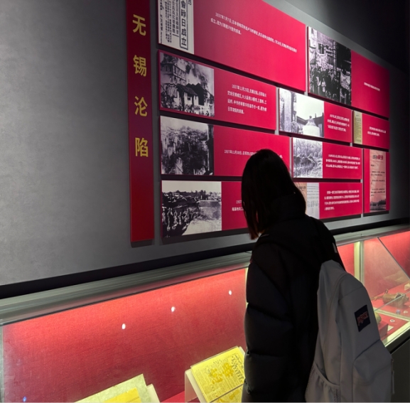 2025年1月20日实践团成员来到无锡博物馆革命历史馆展馆二进行参观学习。在博物院的四层无锡革命陈列馆,我们跟随讲解员的步伐,认真参观了《血与火的城市记忆——无锡革命史》展厅。展厅内,从1919年五四运动起至1949年中华人民共和国成立的革命斗争历程被生动再现。参观过程中,讲解员详细介绍了党的创建和大革命时期、土地革命时期、抗日战争时期、全国解放战争时期四个阶段的发展历程。无锡人民在中国共产党的领导下,经历了艰苦卓绝的革命斗争,哺育了一批批优秀的共产党员和英雄儿女。荣毅仁、秦邦宪等先锋人物的光辉事迹,让我们深受感动,更加坚定了听党话、跟党走的信念。