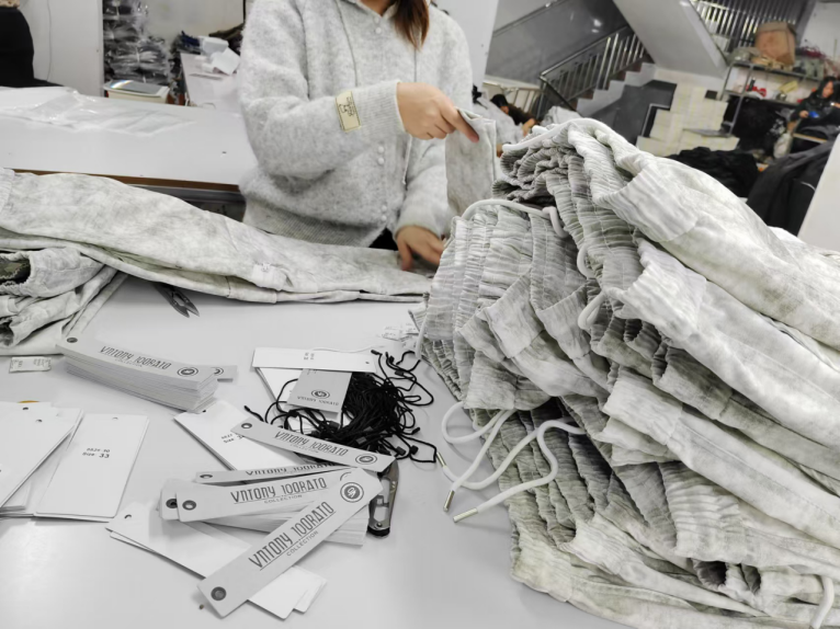 为锻炼动手能力和专注细心品质,成员朱旖旎在服装厂负责服装打包和分装,主要是将熨好的衣服挑出粘连的毛线、剪去多余的线头,然后规整的叠成一个方块,装进包装袋中。不同材质的服装有不同的打包方式,比如灯芯绒裤子质感比较厚重,就需要用到硬纸板进行定型固定,然后再进行折叠,这样方便后续的装袋打包;而较为轻的涤纶材质裤子,就可以直接折叠,在折叠过程中放入干燥剂,打上商标再进行装袋等等。