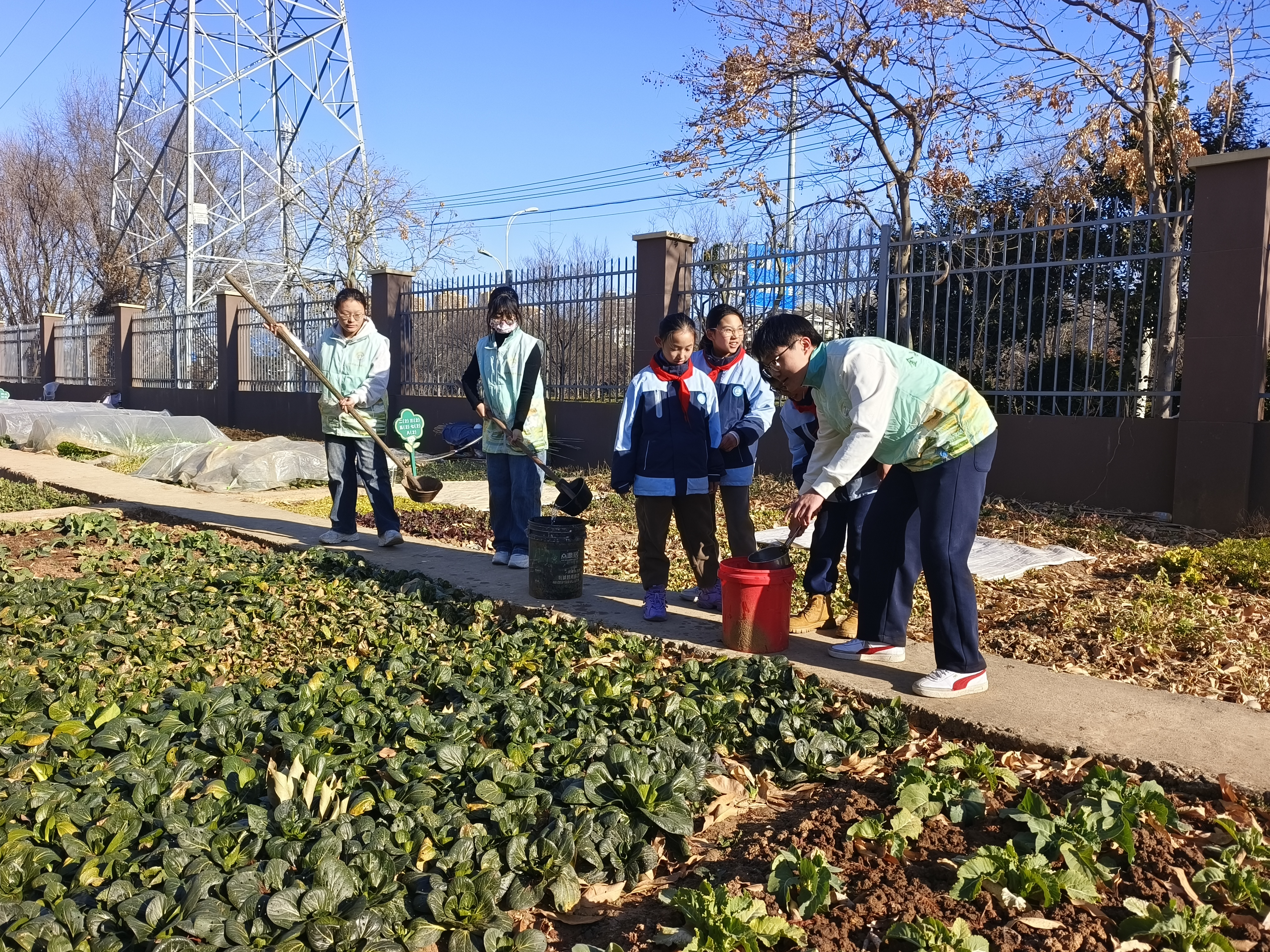 金谷实践团首先前往镇江实验小学官塘分校开展劳动实践教育。在校园的农耕教育基地,实践团成员首先向小朋友们介绍了不同蔬菜的生长习性与成熟期限,随后成员们利用自身所学指导小朋友们学习蔬菜种植技巧,亲身体验农业生产模式,感受饭碗中的每粒粮食与蔬菜的来之不易,与孩子们共同完成了一节田野上的思政课。