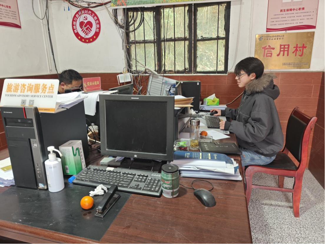 图为刘闯同学在村办事处工作