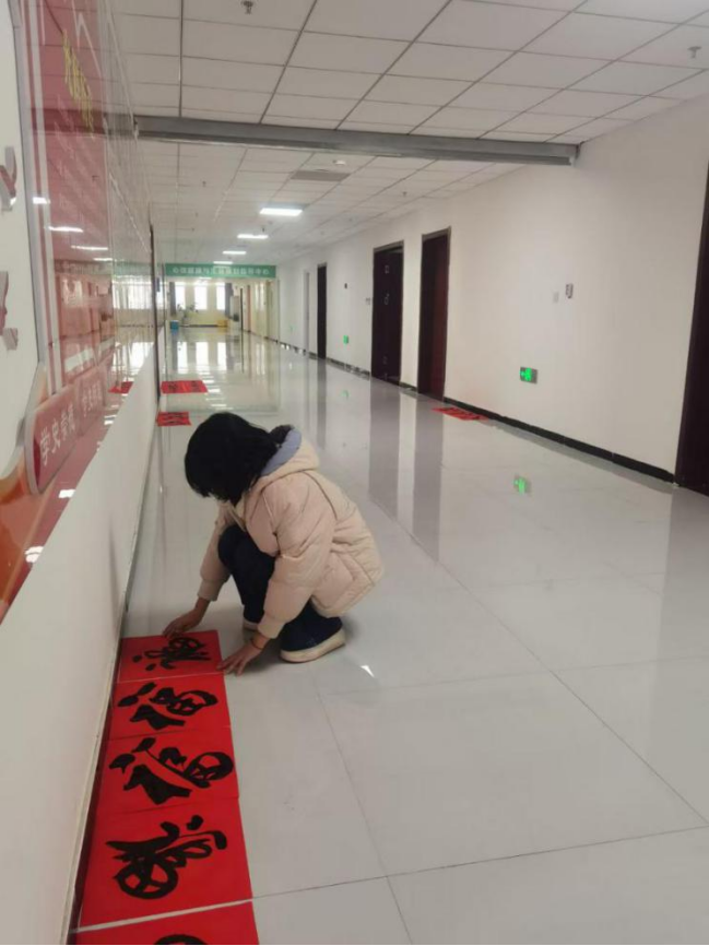 手执毛笔,写下的是祝福,弘扬的是文化。实践团成员,不仅在社区卫生建设方面作出贡献,同时还在社区文化宣传中发光发热。路欣瑜参加社区迎春送祝福活动,负责春联书写、运送的工作。活动当天,她跟随主办方一起到达活动现场,并与其他工作人员一起对场地进行布置,为书法老师们准备好笔墨纸砚。活动开始后,她随时待命,哪里需要帮忙就及时行动,在书写大字版春联时,帮助拉动春联纸,在书写单字福时,及时将写好的福字放到指定地点晾干。在活动结束后,将活动用具整理收拾,并将活动场地恢复如初。活动团成员王梓童认真书写新春祝福,并将写好的春联送给社区的居户,他将自己的专业与书法结合写下了“四时安泰人间乐,五谷丰登天下平”的对联,她说:“身为一个粮食人,无论是在写下‘五谷丰登天下平’时,还是将对联送给社区里的邻居,并且向他们普及粮食安全的重要性并且得到肯定时,心中的成就感与自豪感都会油然而生,在弘扬传统文化、为社区添温情的同时树立专业自信心,这就是实践活动让我收获最大的一点。”