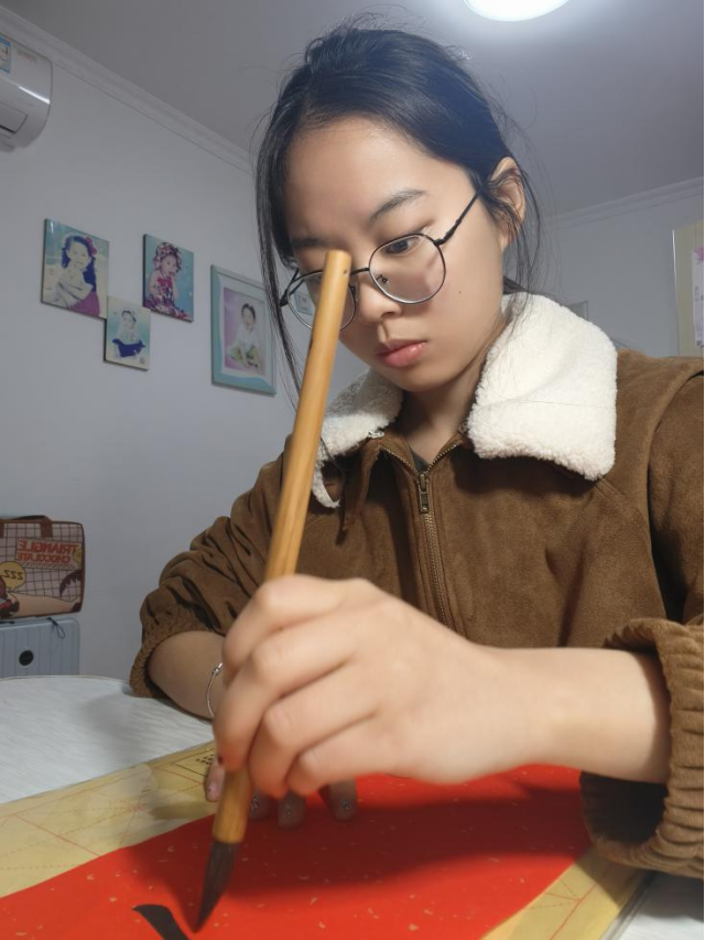 图3 路欣瑜整理刚写好的春联